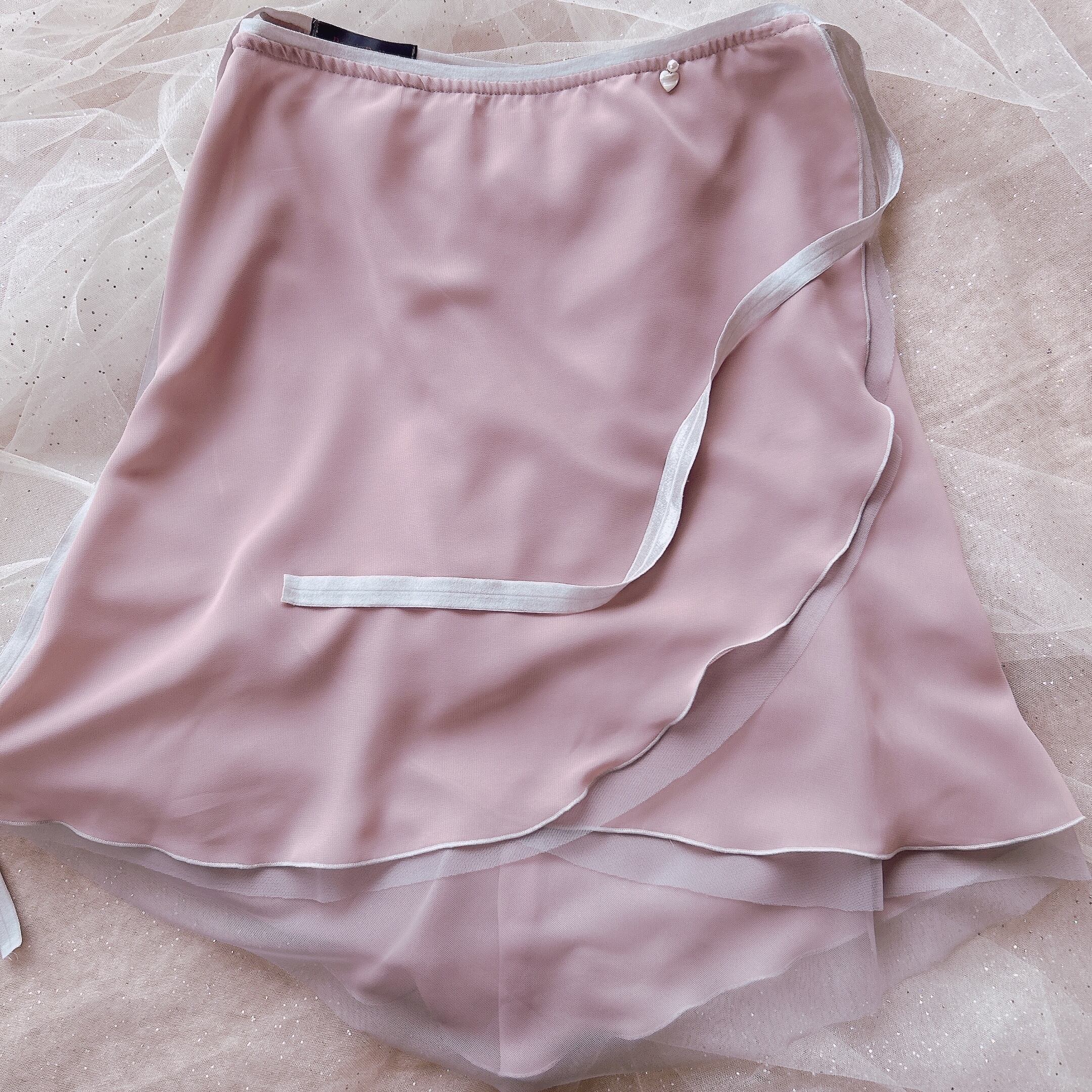 バイカラースカートは裾から見えるチュールが踊った時にも美しく、凛とした大人の佇まい。ウエストのハート♡シェル&パールパーツがアクセントに!
