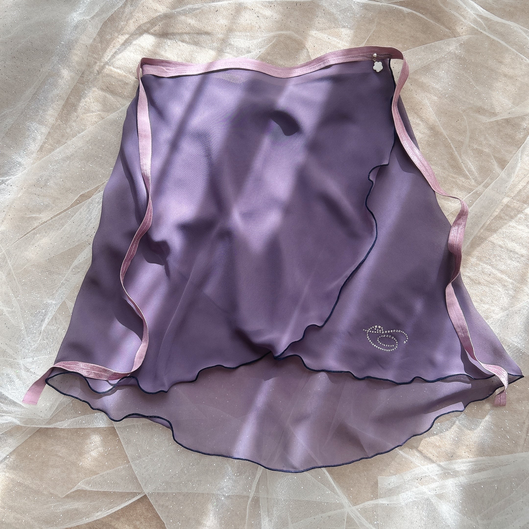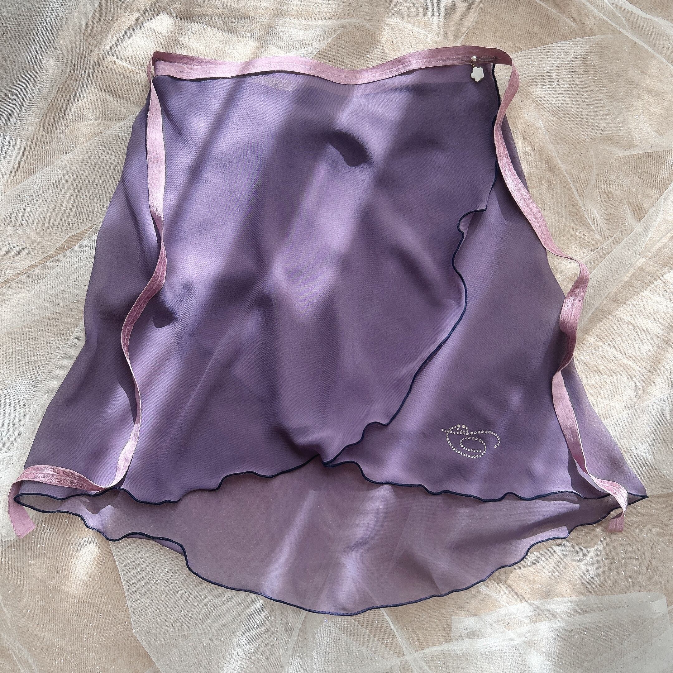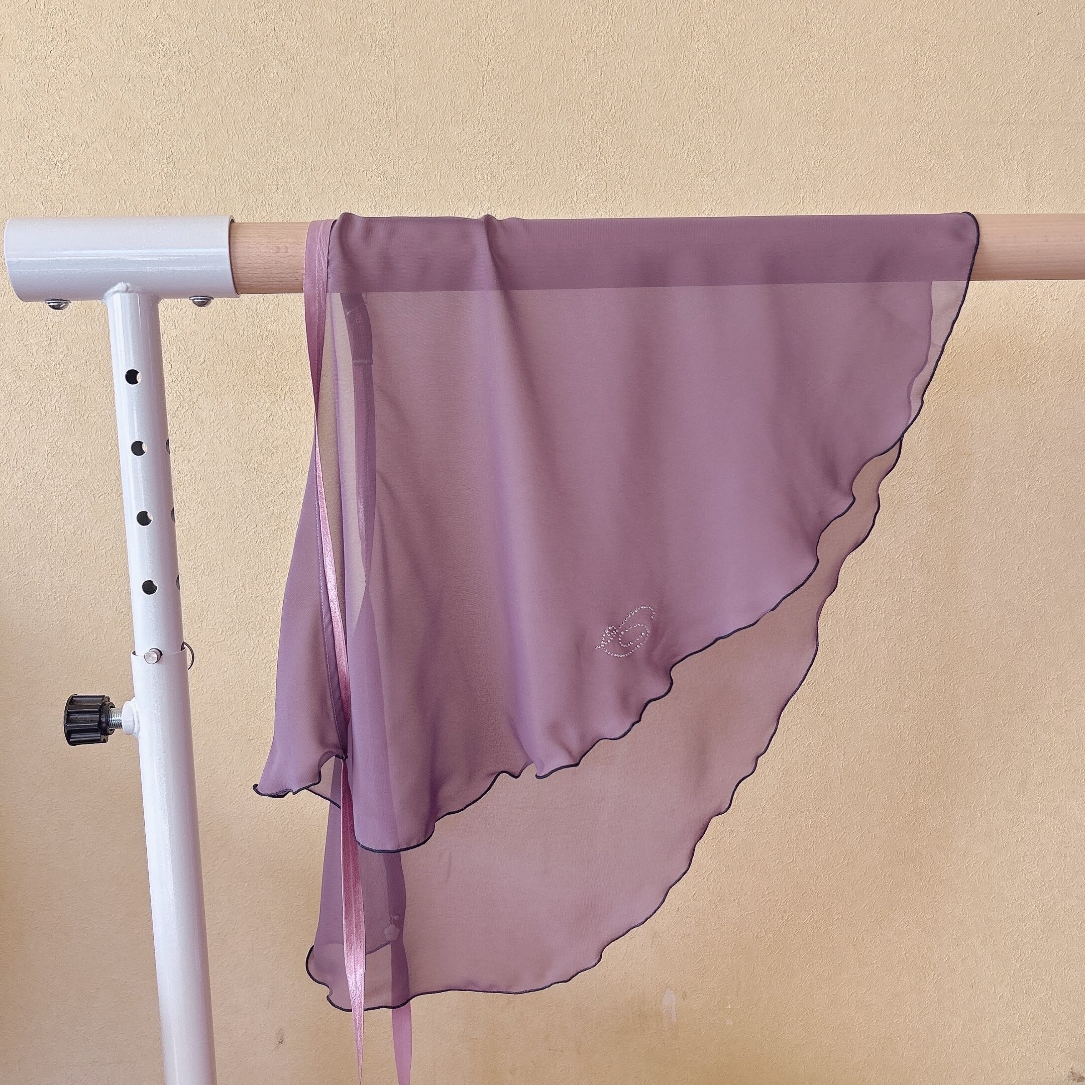 上品なプラムカラーと煌めくクリスタルが特徴のバレエ巻きスカート。優雅なデザインは、踊るたびにふんわりと広がり、シンプルなデザインも楽しむことができます。