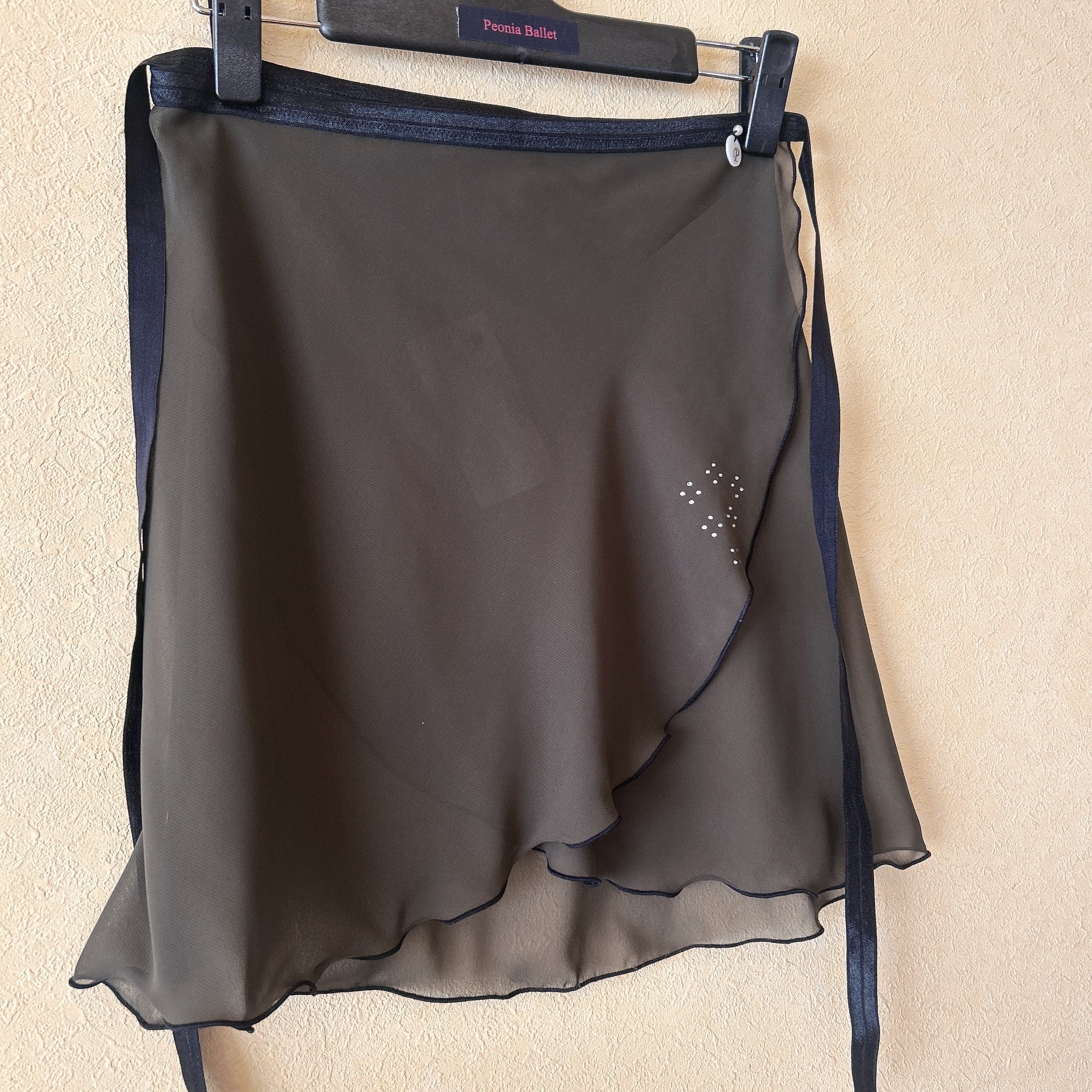 深いオリーブグリーンに煌めくクリスタルが美しいバレエ巻きスカート。落ち着いた色味が特徴で、動くたびに華やかさが引き立ち、シンプルでありながら存在感のあるデザインです。