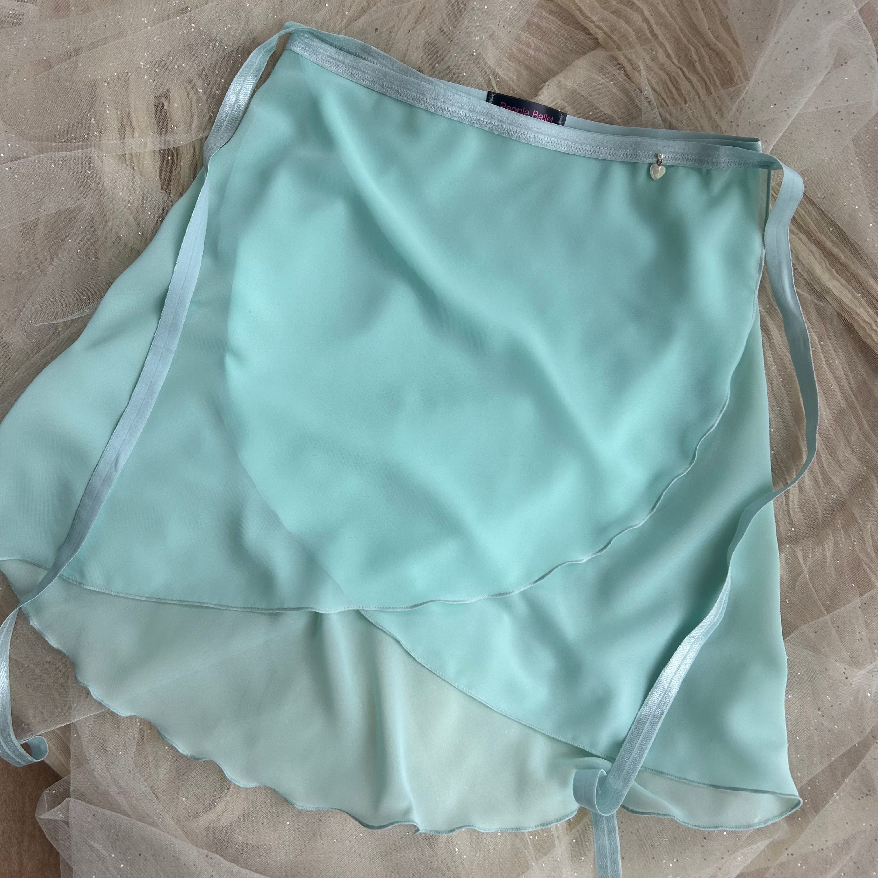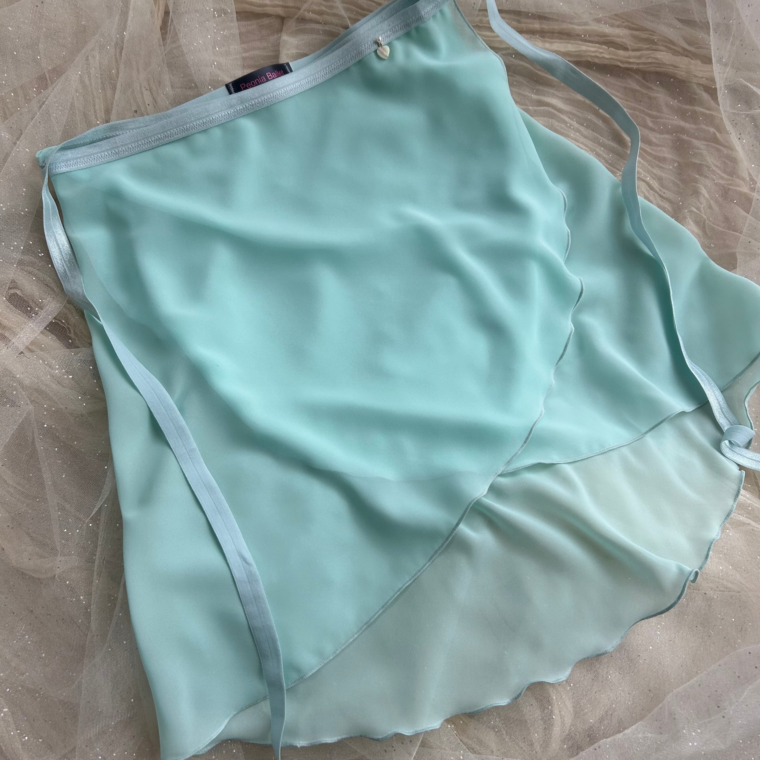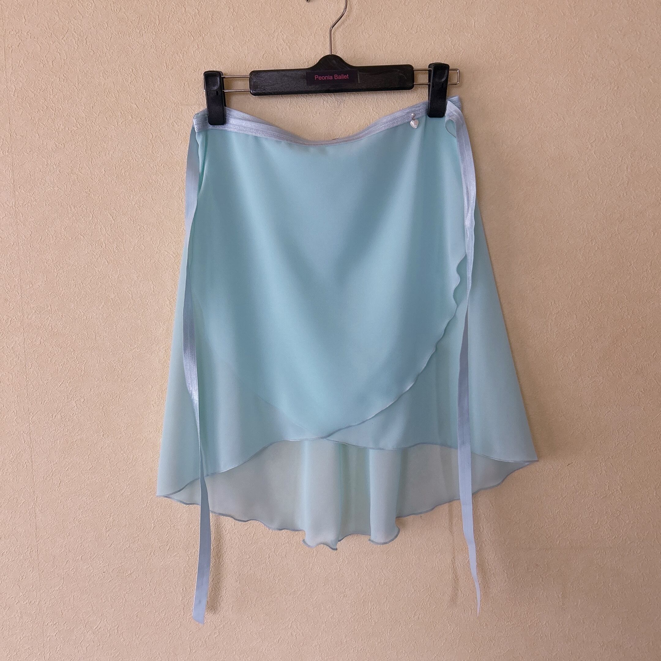 華やかなライムグリーンにアイスブルーのリボンテープが映える、上品なバレエスカート。軽やかなシフォン素材を使用し、後ろの柔らかなドレープ感が特徴です。ウエスト部分のゴムリボンは安定感があり、快適な着心地でどんな動きにもぴったりフィットしやすいです。