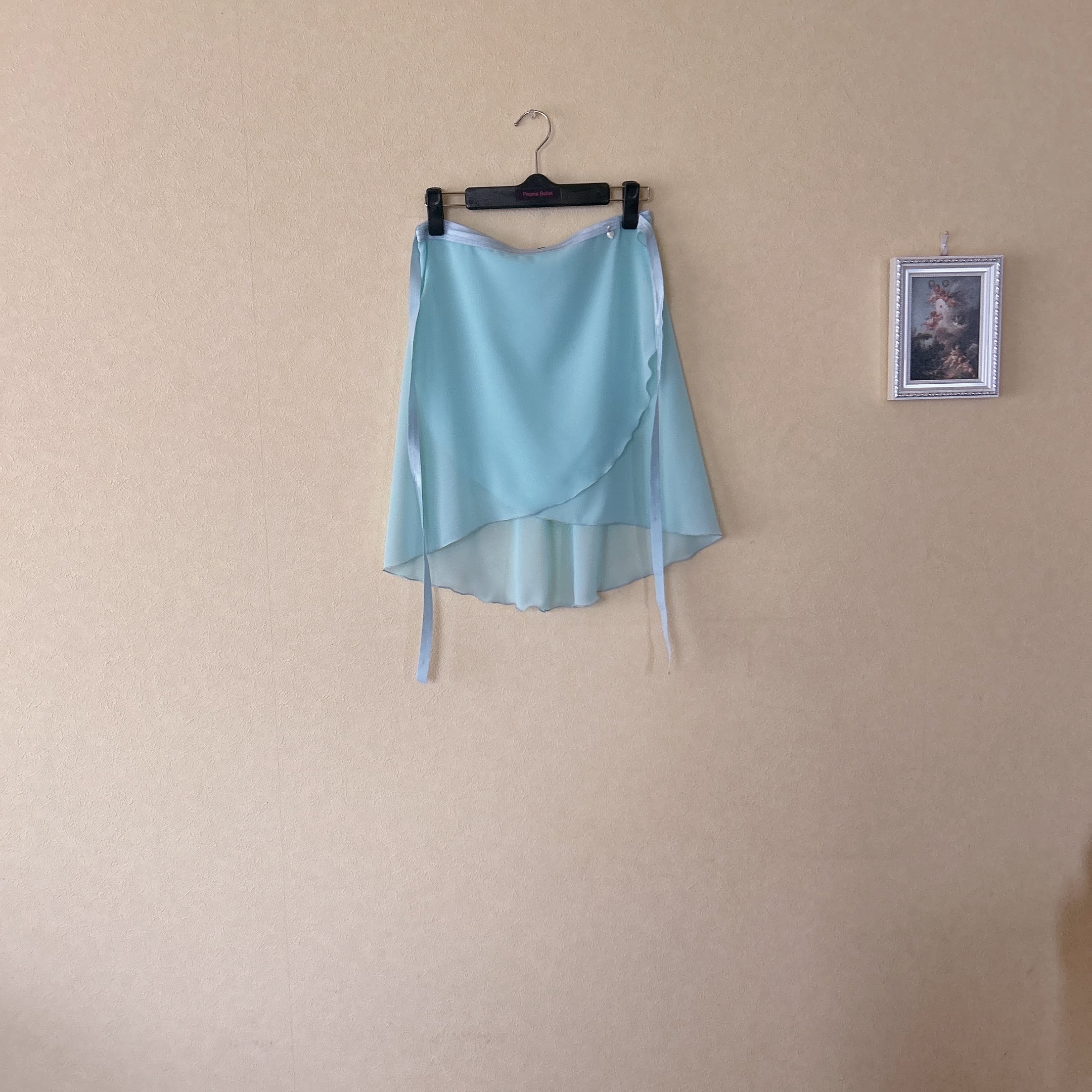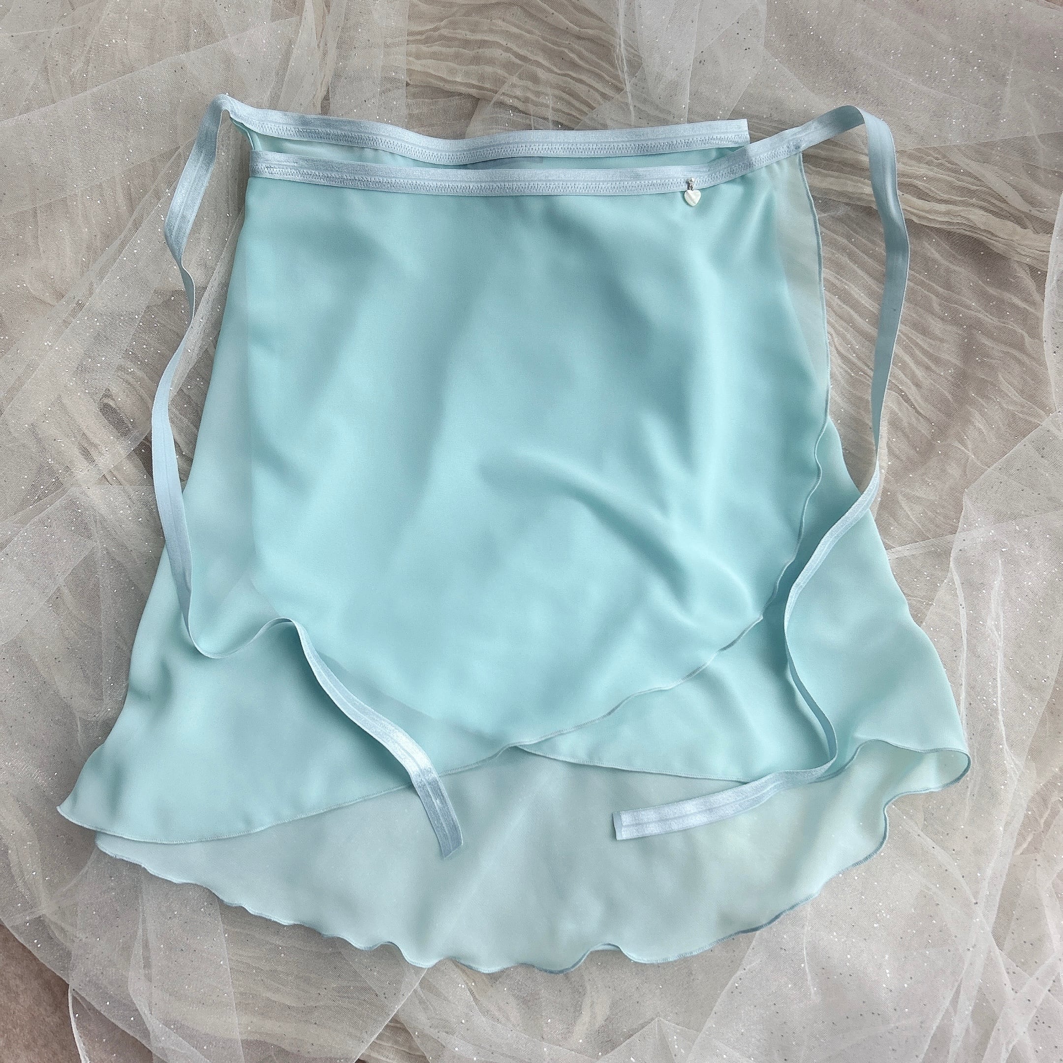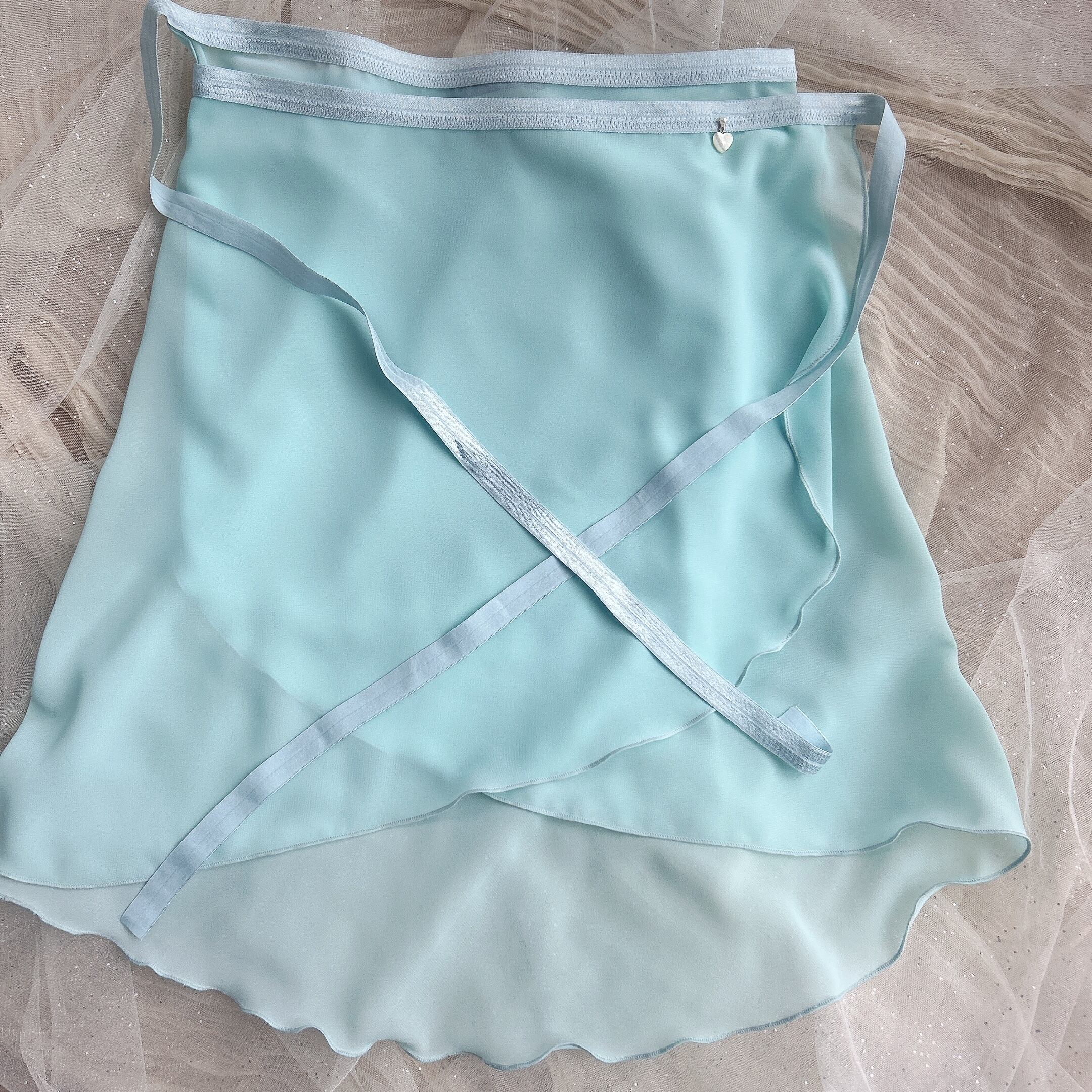 華やかなライムグリーンにアイスブルーのリボンテープが映える、上品なバレエスカート。軽やかなシフォン素材を使用し、後ろの柔らかなドレープ感が特徴です。ウエスト部分のゴムリボンは安定感があり、快適な着心地でどんな動きにもぴったりフィットしやすいです。