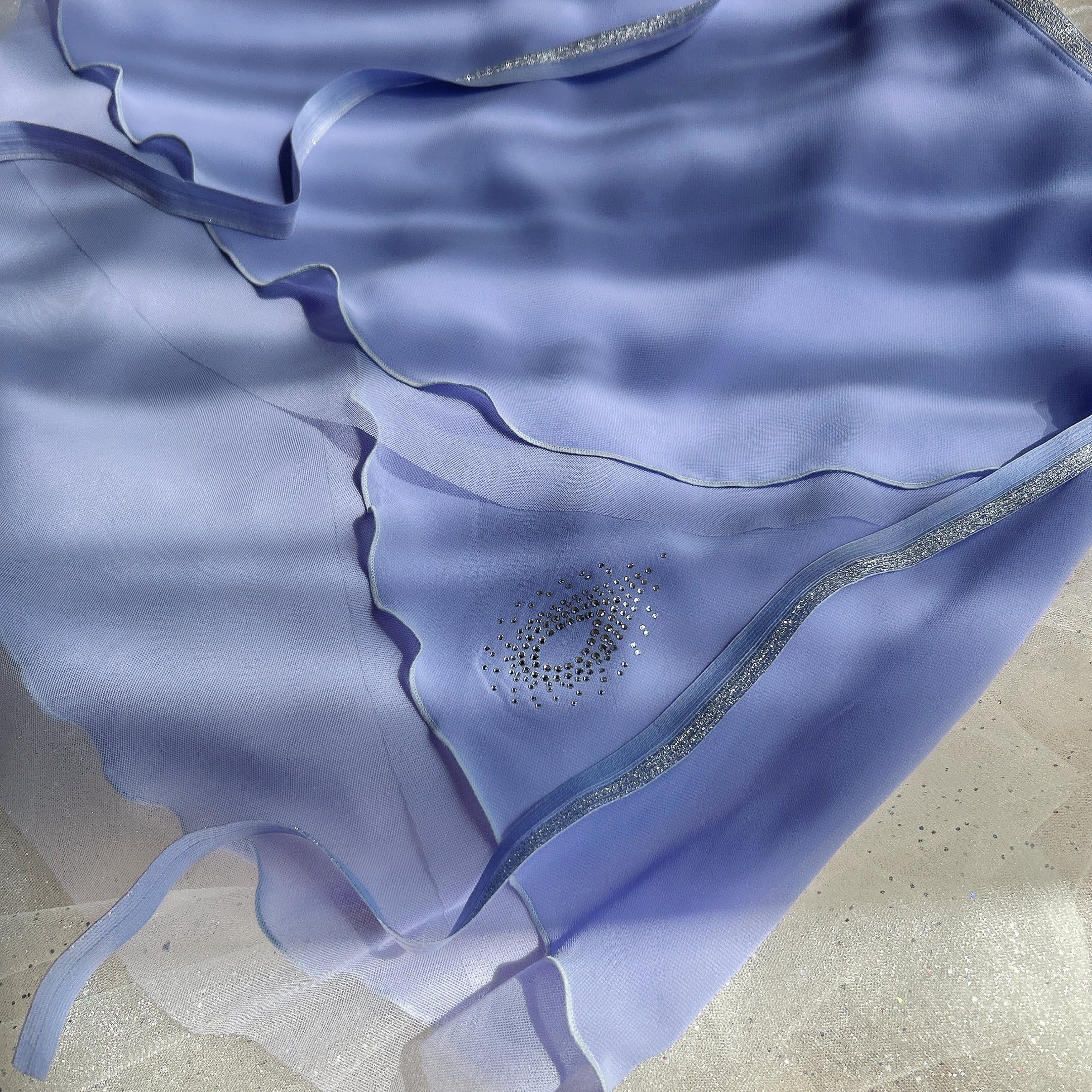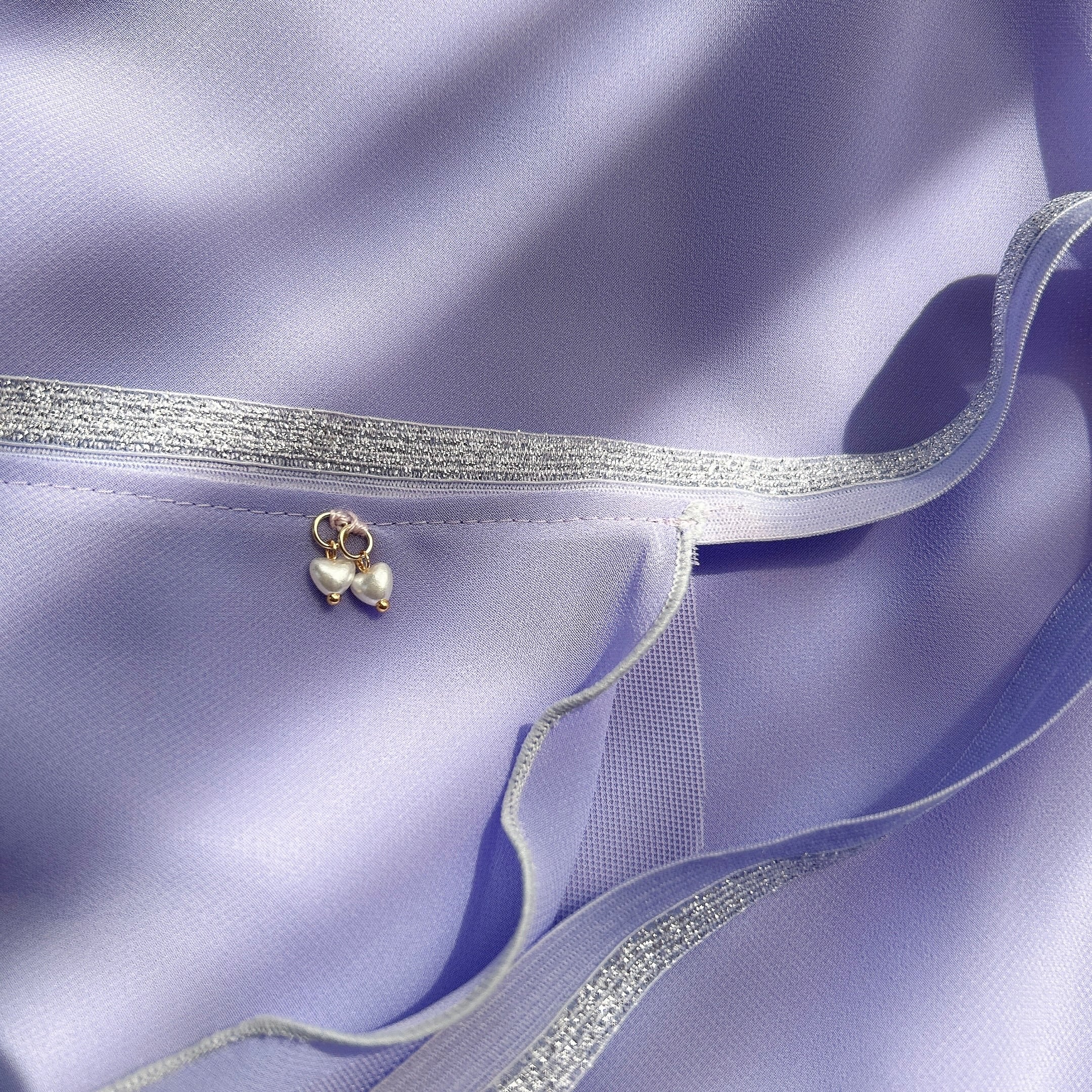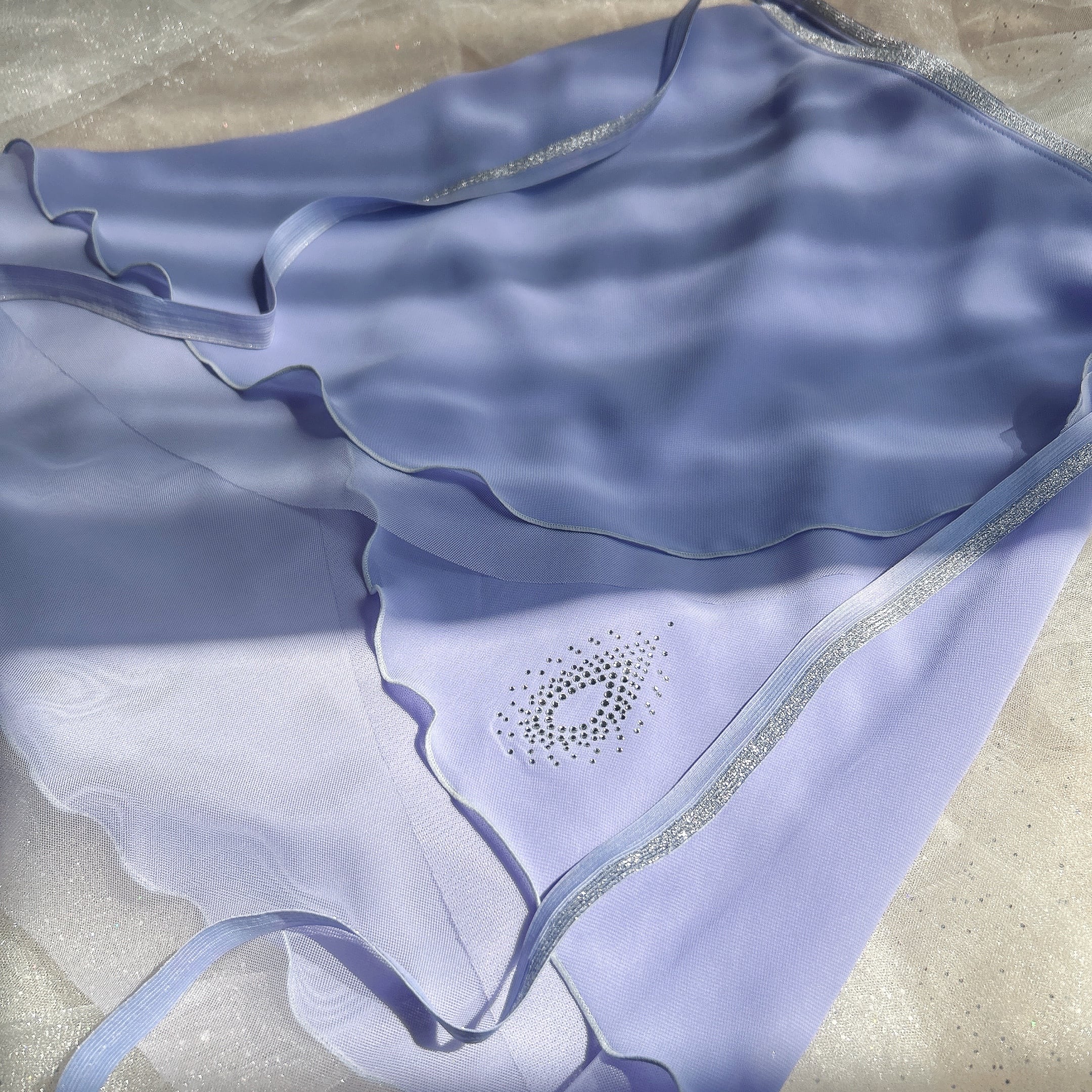 ラベンダー色のシフォンとチュールを重ねた、絶妙な色合いのリバーシブルデザインで特別感のある華やかなバレエスカート。クリスタルがポイントになっており、動くたびにキラキラと輝きます。軽やかな素材感とふんわりとしたシルエットです。ゴムリボンテープは珍しいラベンダーとシルバーのハーフ使いで、伸縮性のあるゴム仕様なので安定感抜群で快適な着心地が魅力です。パールハート♡付き。
