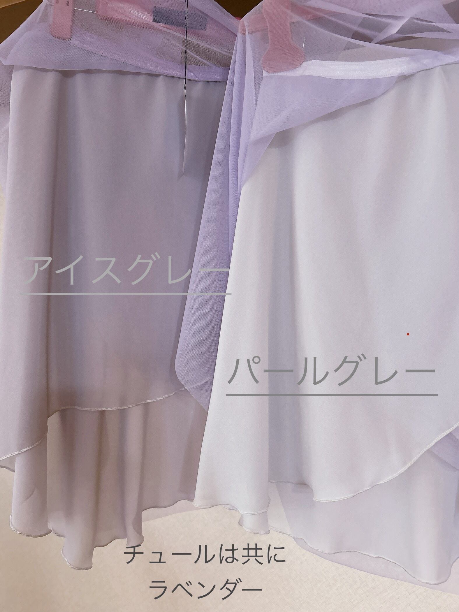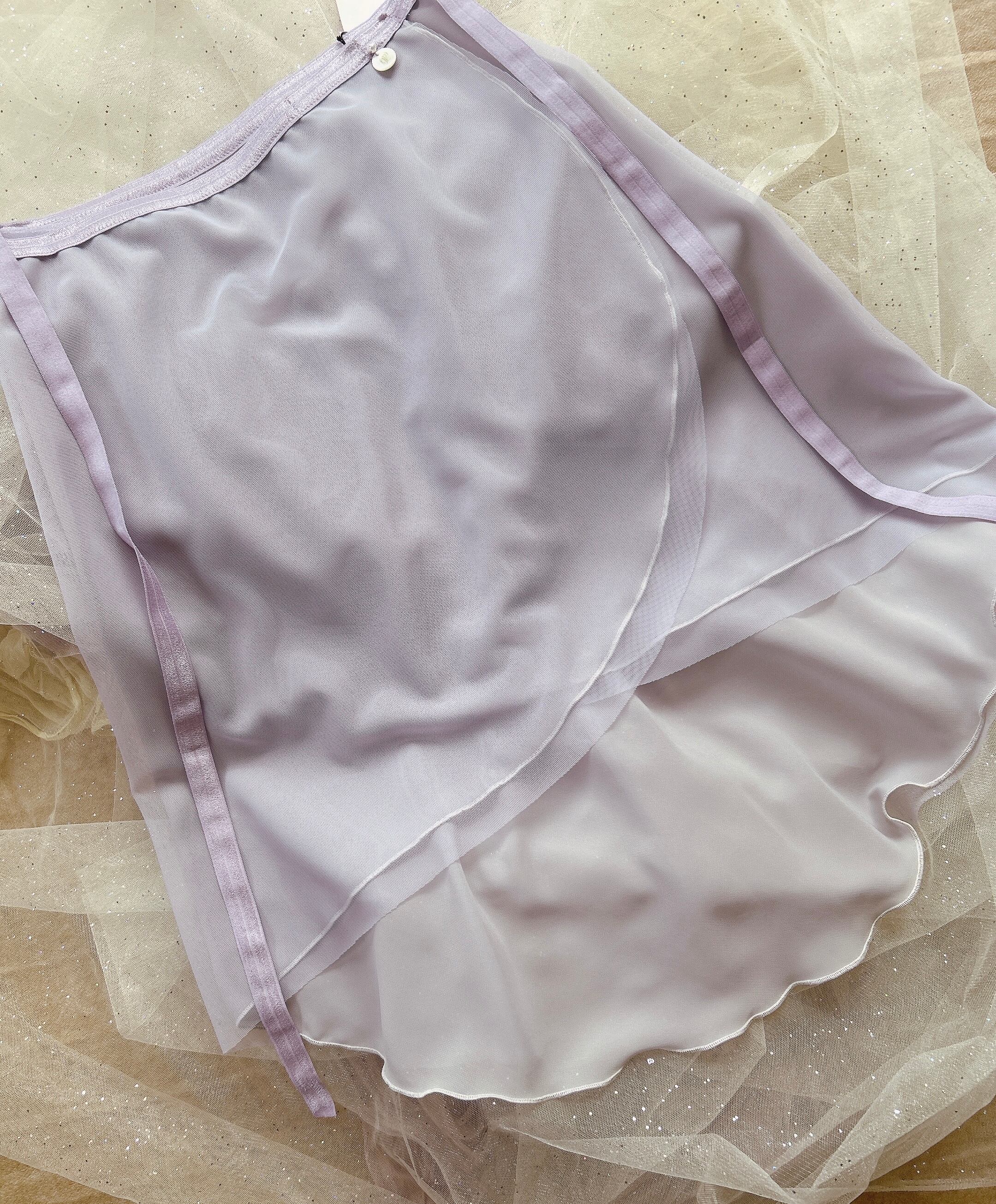 ✨ラベンダー色を重ねることでニュアンスのあるグレー色になっており、踊ったり、角度や自然光、照明で色んな色の表情が見えるスカートです。どんな色のレオタードにも合わせ易いです。アイスグレーとラベンダー合わせが何とも上品!